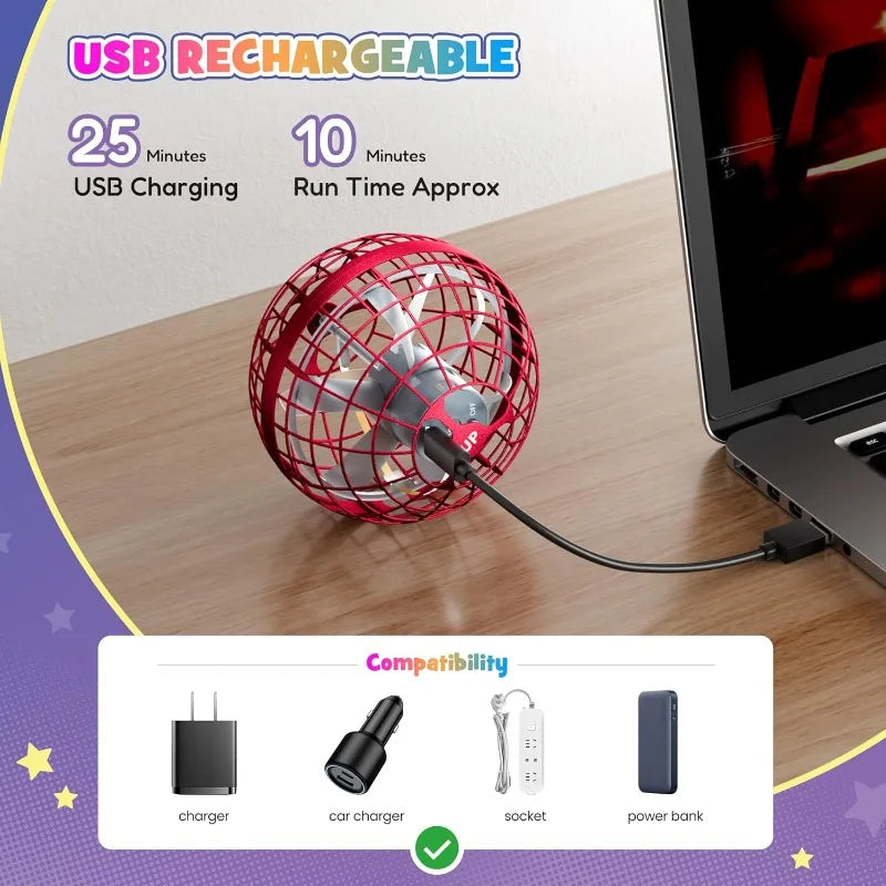 The Flying Orb Ball can fly for 8–10 minutes on a full charge. It only takes about 25 minutes to recharge using the included USB cable.